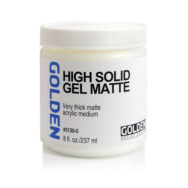 Golden High Solid Gels are available in Gloss or Matte this product is a thicker consistency than Golden Heavy Body Acrylic colours, similar to Extra Heavy Gels. Lower shrinkage and dries to the touch quicker than most Gels. Good for holding peaks. Blends with colours to make them feel more oil-like and increases retention of brushstrokes.