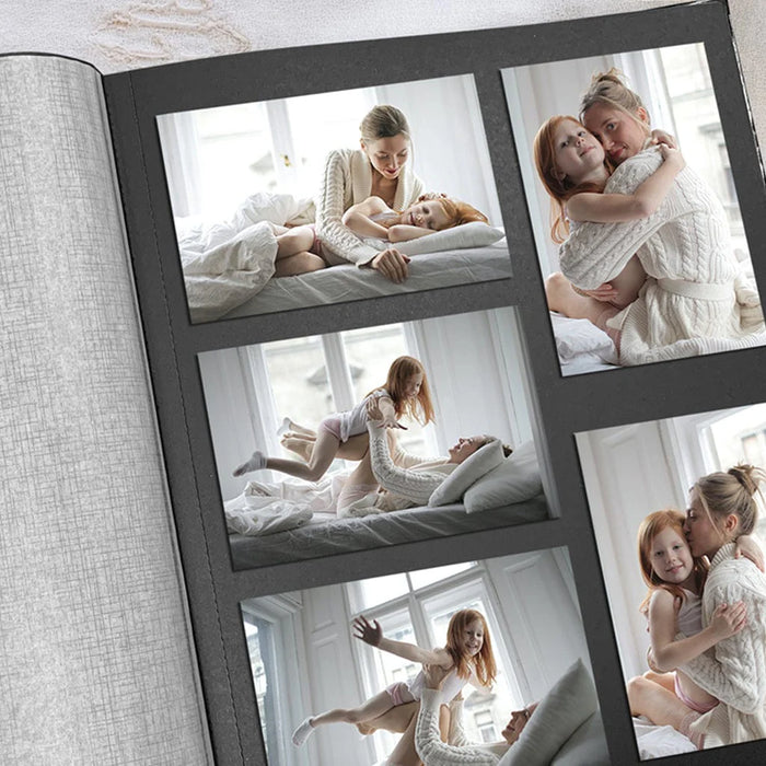 Heavy 250gsm black drymount pages are acid-free and photo-safe, offering a secure surface for photos and mementoes. -